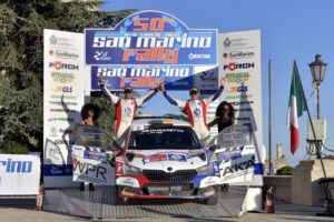 Che si è delineato nettamente solo alla fine dell’ultima prova speciale, dove il duello prolungato tra Andrea Crugnola e Paolo Andreucci si è risolto, per un solo decimo di secondo, a favore del primo. Andrea Crugnola, con Ometto alle note e al volante della Citroen C3 Rally2 FPF, vittima anche di una foratura a metà giornata, raccoglie così, oltre ad un prestigioso secondo posto assoluto, anche il primato tra gli equipaggi iscritti al CIAR Sparco (con il “San Marino” che aveva un coefficiente maggiorato per la massima serie tricolore), con il varesotto che completa un poker di vittorie su quattro gare di campionato. L’esperto e sempre veloce pluricampione Paolo Andreucci, con a fianco Briani, a bordo della Skoda Fabia Evo Rally2 HSport gommata MRF ha cercato fino all’ultimo di contrastare Crugnola, ma comunque porta a casa il secondo posto tra gli equipaggi in caccia del CIRT, il tricolore terra, alla quale dal San Marino Rally si aggiunge anche Gryazin. L’altro duello “tricolore” tra il ligure Fabio Andolfi e Giandomenico Basso si è invece concluso con Andolfi, affiancato da Gonella nella Fabia Rally2 by Munaretto, quarto assoluto e il campione veneto, con Granai alle note, sconsolatamente fuori strada con la Skoda DeltaRally nelle fasi finali. Già nella prima speciale di giornata, invece, una uscita di strada aveva tolto di scena l’atteso protagonista Giacomo Costenaro, con Bardini. L’ein-plein di vittorie di Gryazin nelle otto prove speciali in programma oggi è stato impedito da un Tommaso Ciuffi in forma smagliante. Sempre più a suo agio con la Skoda Fabia gommata Michelin e con il giovane Cigni a fianco, il pilota fiorentino ha siglato il secondo passaggio su “Lunano”, andando a conquistare un quinto assoluto da incorniciare, diventato sesto, nel post-gara, in seguito alla applicazione a ben 40 equipaggi di una penalità di 2 minuti, causata dalla mancata applicazione del contenuto della Circolare Informativa n. 2. Questo faceva risalire Daniele Ceccoli, con Capolongo (Skoda Fabia Rally2), il pilota del Titano ultimo vincitore assoluto sulle strade di casa, dall’11esimo al quinto posto, seguito in scia dal riminese Angelo Pucci Grossi, con Cardinali: suo anche stavolta, come al rally Val d’Orcia, il Trofeo per il primo tra gli Under 25 dedicato a papà e campione Giuseppe “Pucci”. Altro equipaggio che sale in classifica, non essendo incappato nell’errore al C.O. di cui sopra, è Gianesini- Bergonzi, ottavo, davanti al bergamasco Enrico Oldrati, con De Guio (Skoda Fabia Rally2).